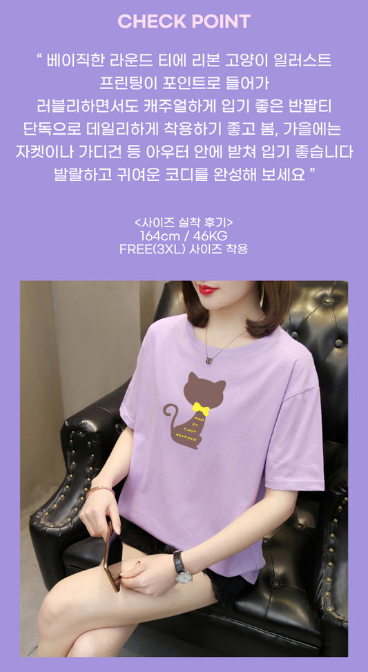 여자 루즈핏 고양이 레터링 라운드 반팔티 오버핏티셔츠 스판 아이스 티셔츠